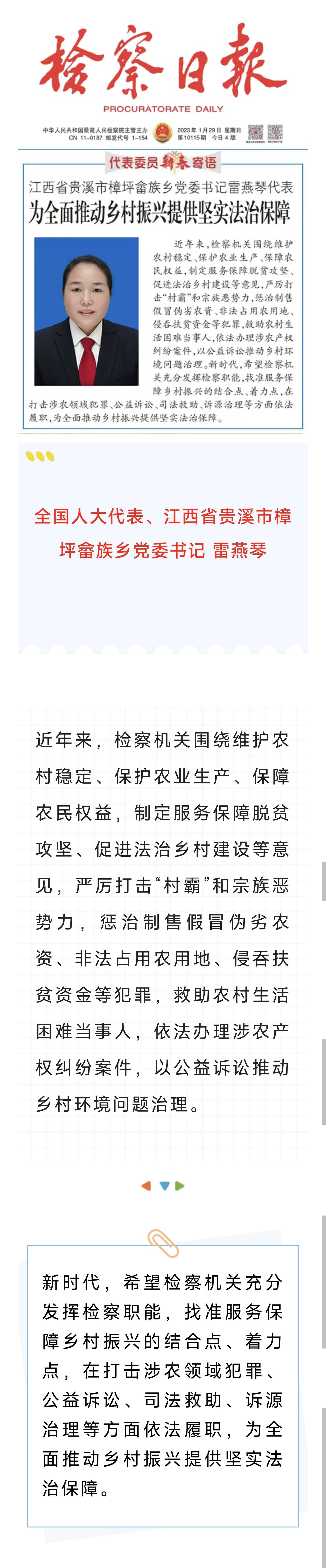 【代表委员之窗 · 检察日报头版】雷燕琴:为全面推动乡村振兴提供坚实法治保障