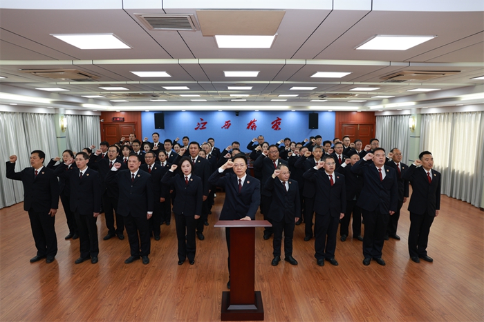 省检察院党组成员、副检察长熊良明领誓,省检察院副检察长杨峰、南昌铁路运输检察分院检察长张诗美等53名省检察院及派出院2024年度新任检察官、新任处级领导干部、新入职人员参加宣誓。