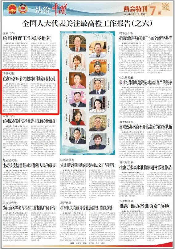 “律师是全面推进依法治国中不可或缺的重要力量,发挥着维护当事人权益、促进司法公正公信的重要作用。律师与检察官在追求公平正义的价值目标上具有同向性,在尊重和保障人权的功能作用上具有互补性。”全国人大代表,江西省律师协会副会长、国浩律师(南昌)事务所主任冯帆在接受记者采访时表示。