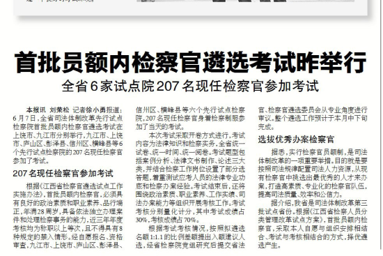 【编者按】6月7日,江西省检察机关举行试点院首批检察官入额考试。新闻处积极协调中央和省内主流媒体。目前检察日报、江西卫视、新法制报、人民网、法制网、正义网、江西政法网等媒体对活动进行集中宣传报道。