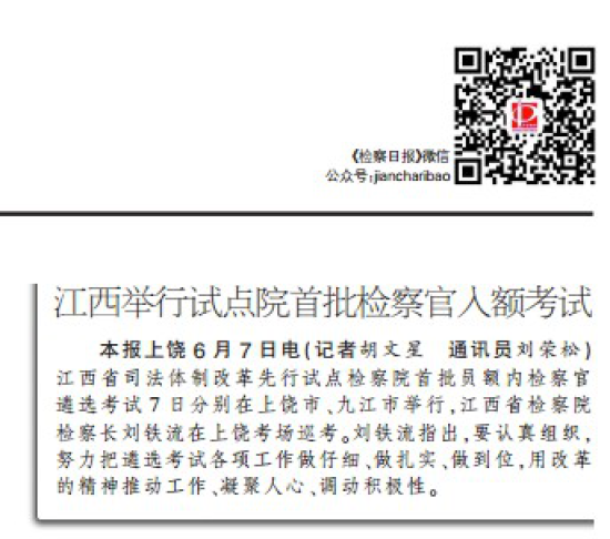 【编者按】6月7日,江西省检察机关举行试点院首批检察官入额考试。新闻处积极协调中央和省内主流媒体。目前检察日报、江西卫视、新法制报、人民网、法制网、正义网、江西政法网等媒体对活动进行集中宣传报道。